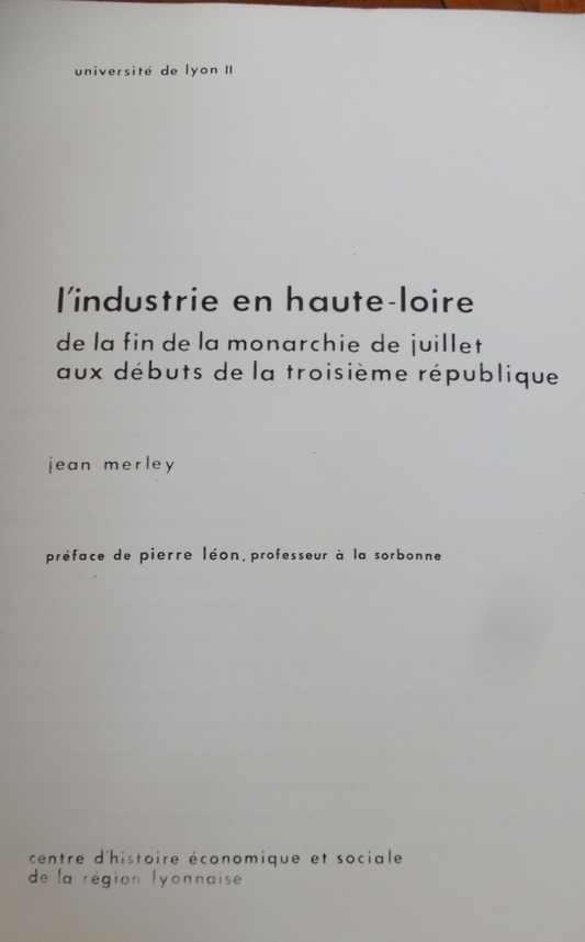 L'Industrie en Haute-Loire de la fin de la monarchie de Juillet (J. Merley) 1972