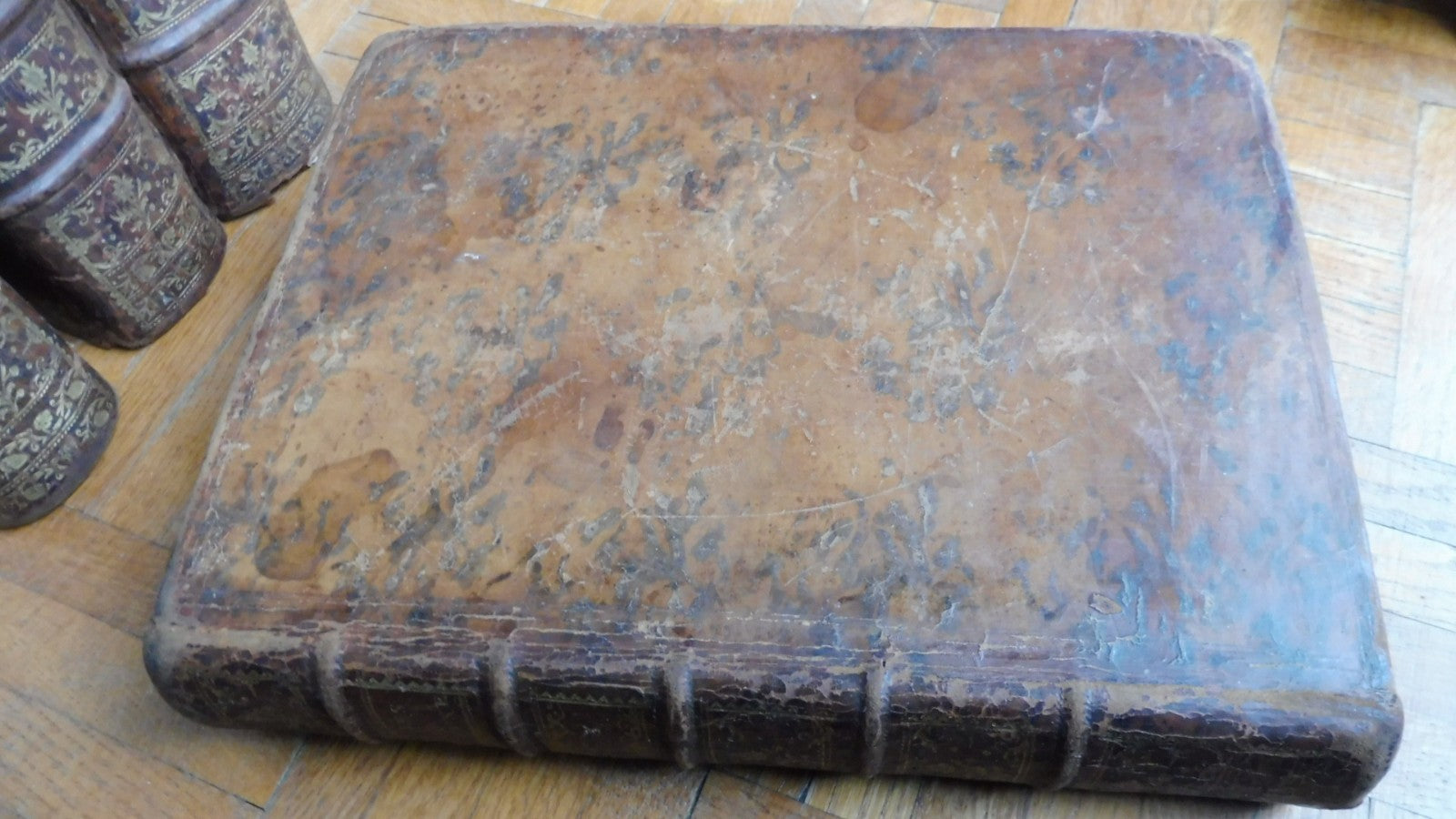 Plein veau du temps. Dos à 5 nerfs, ornés, état correct. Coiffe du t.IV rognée. Mors inférieur gauche du t.IV fendu sur 8 cm. Plats en état d'usage, corrects. Tranches sanguine. Usures, quelques rousseurs et mouillures anciennes.