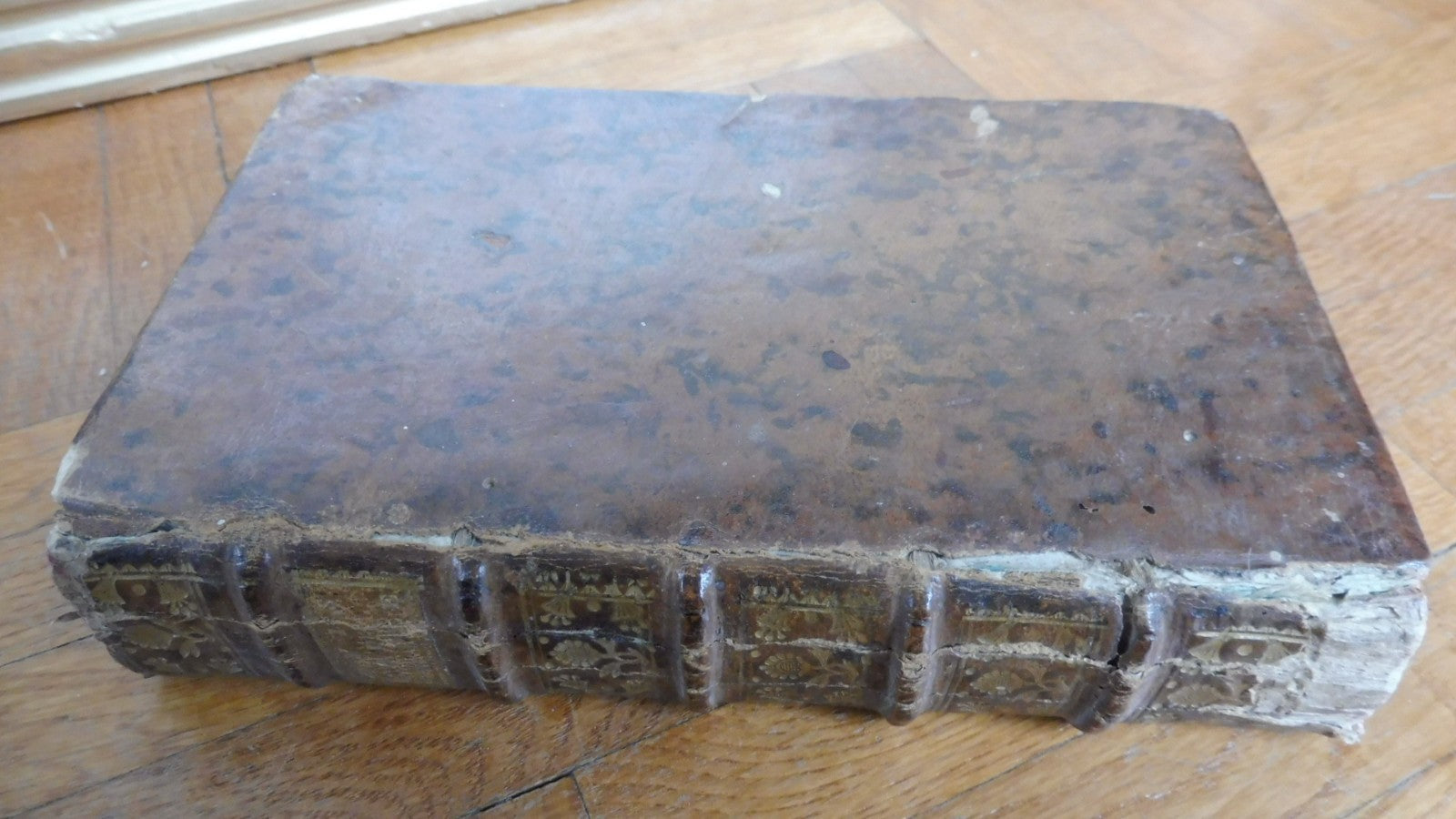 Plein veau du temps. Dos orné, 5 nerfs et pièce de titre, épidermures, coiffe rognée, manque à la queue (voir photo). Mors fendus, solidaires néanmoins. Plats en état d'usage, quelques manques. Tranches sanguine. Intérieur correct.