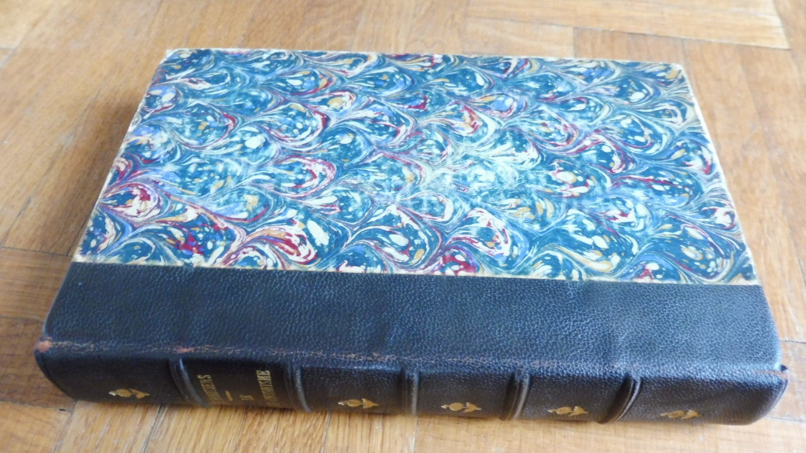 Demi cuir à 5 nerfs. Dos et coiffe corrects. Mors idem, un peu secs. Plats en état d'usage. Tranches passées. Rousseurs.