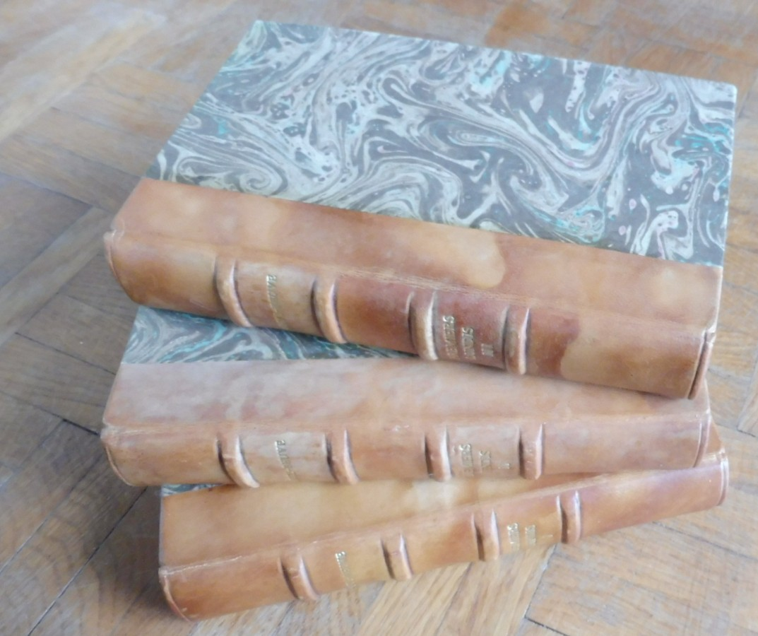 Demi cuir à 4 nerfs. Dos corrects. Coiffes et mord idem. Plats corrects. Tranches assez fraîches. Intérieur frais.