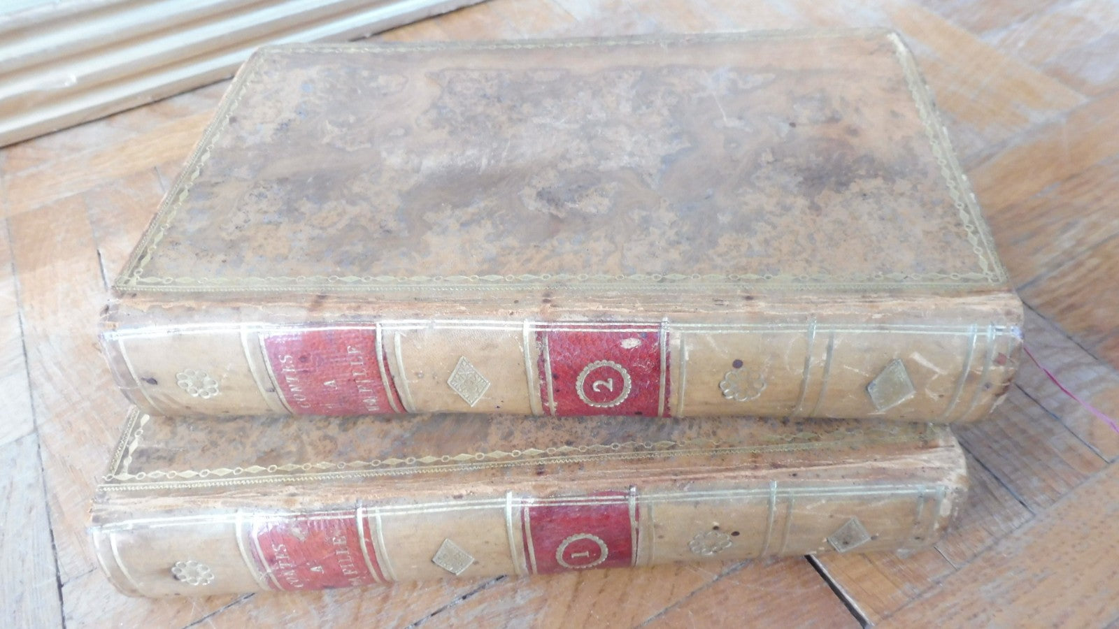 Pleins cuirs à dos lisse, pièces de titre et tomaison. Reliures en état correct, menues épidermures. Tranches correctes. Mouillures anciennes et rousseurs.. t. 1 : vignette de titre + 10 gravures. t. 2 : pièce de titre + 6 gravures.