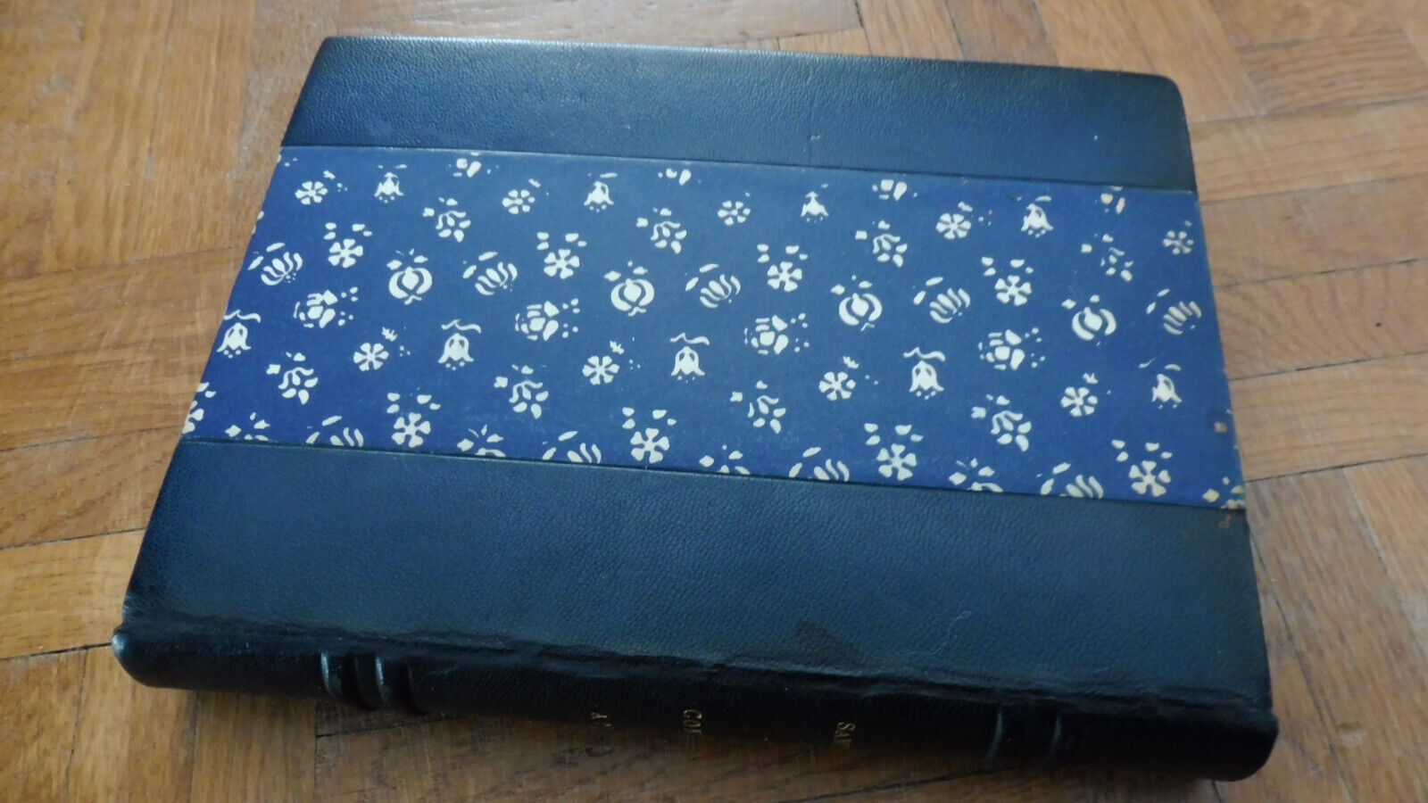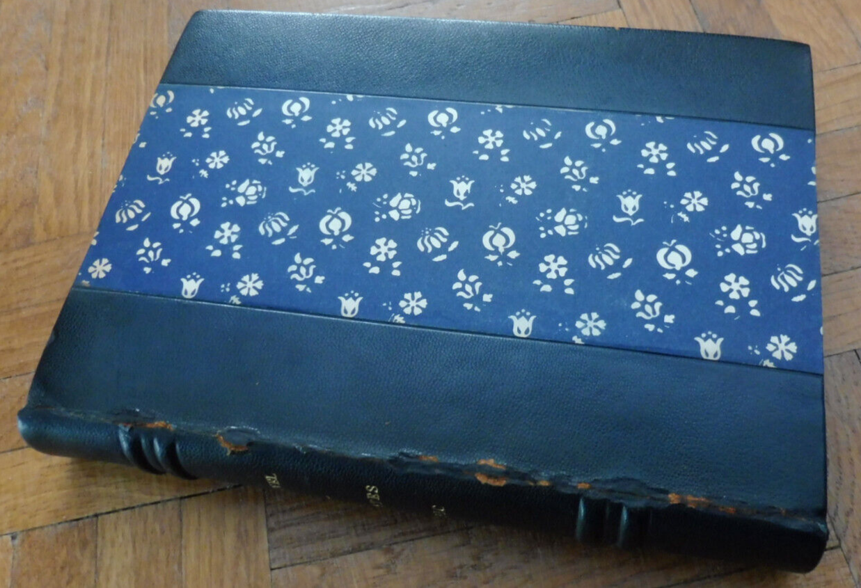 Demi cuir à 2 nerfs et bandes. Dos et coiffe en bel état. Mors fatigués, épidermures, secs, débuts de fentes. Plats corrects. Tranches correctes. Tranche supérieure dorée. Couverture conservée. Intérieur frais.