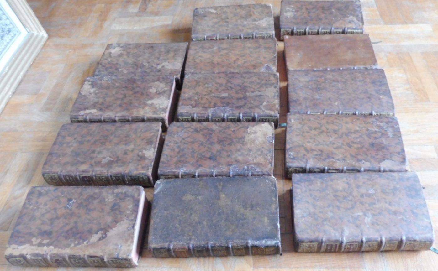 Pleine basane du temps à 5 nerfs. Dos ornés, état d'usage. Coiffe correcte. Coiffe du t. XI-2 rognée. Mors corrects. plats en état d'usage, manques et épidermures. Tranches sanguine.
