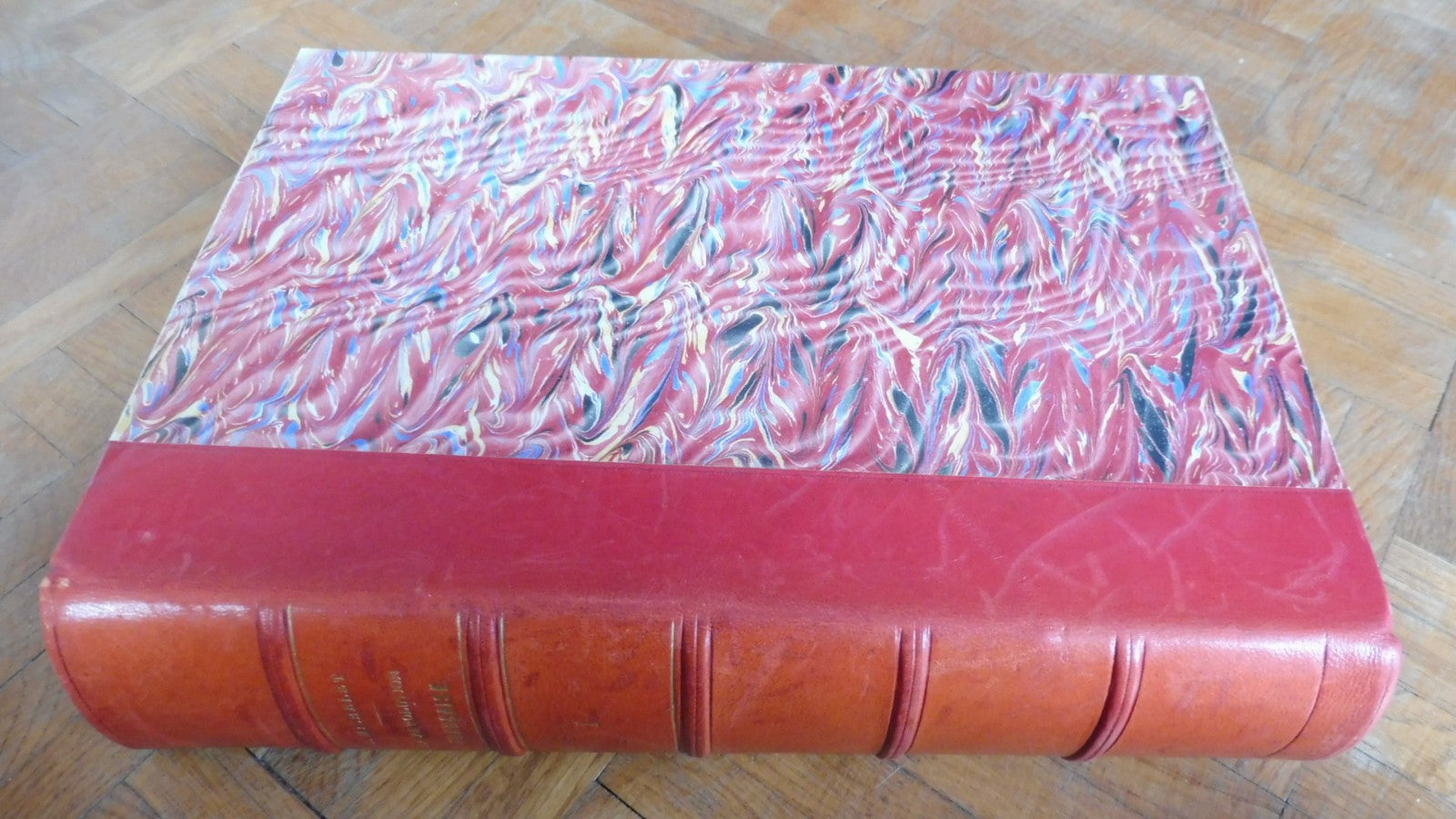 Demis cuir à 5 nerfs. Dos, coiffes et mors en bel état. Plats idem, quelques frottements. Tranches passées. Tâches et rousseurs.