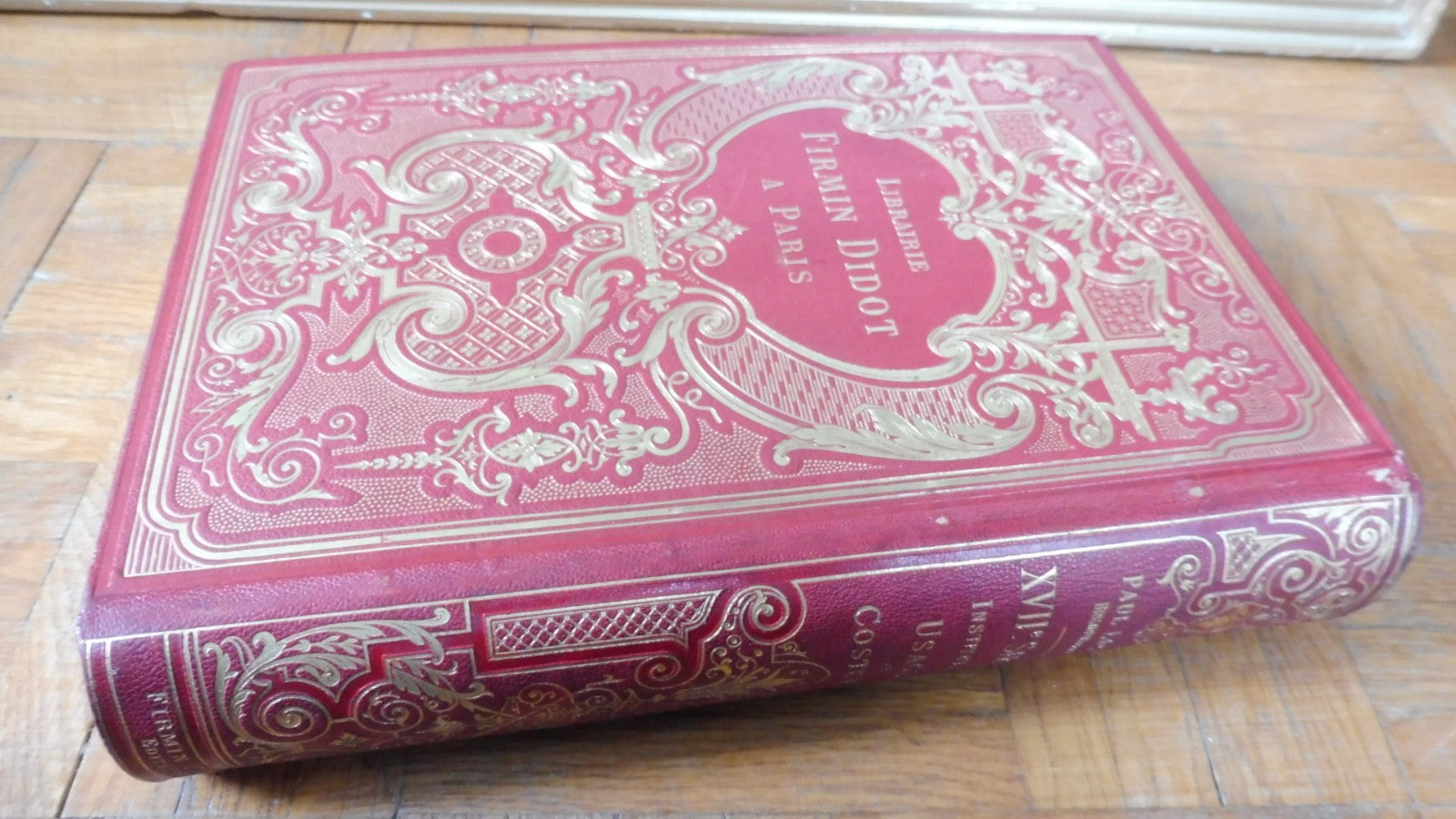 Demi cuir. Dos lisse, orné, bel état. Coiffe et mors sains. plats ornés. Toutes tranches dorées. 300 gravures sur bois et 17 chromolithographies couleurs. Rousseurs éparses.