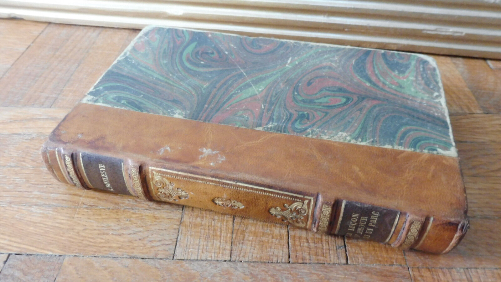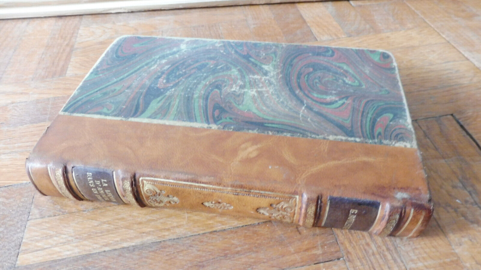 Demi cuir à 4 nerfs et pièces de titre. Dos orné, usagé. Coiffe et mors idem, frottements. Plats en état d'usage, frottés, bords fatigués. Tranches passées. Intérieur assez frais.
