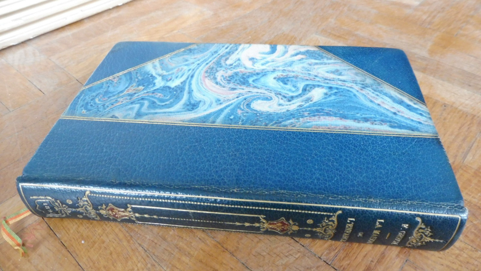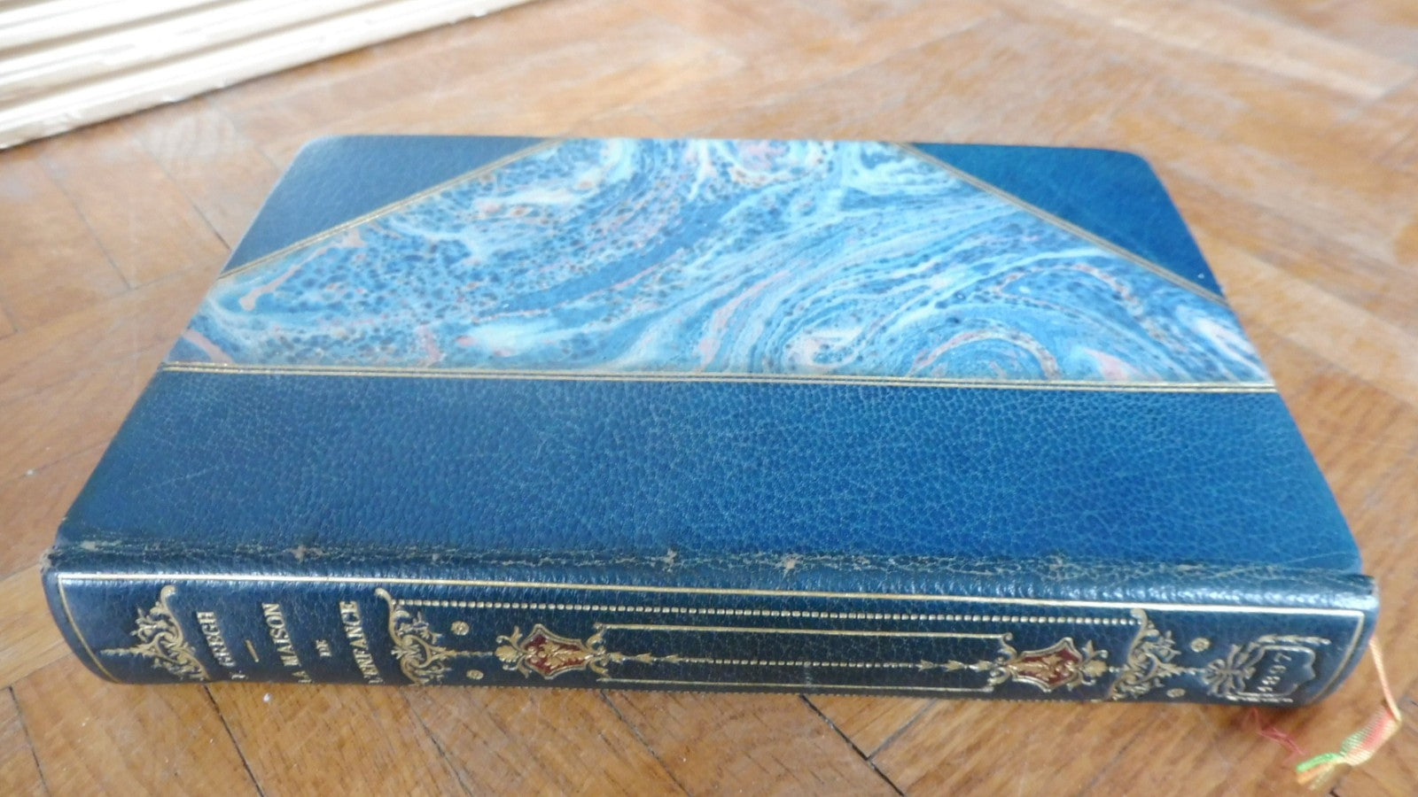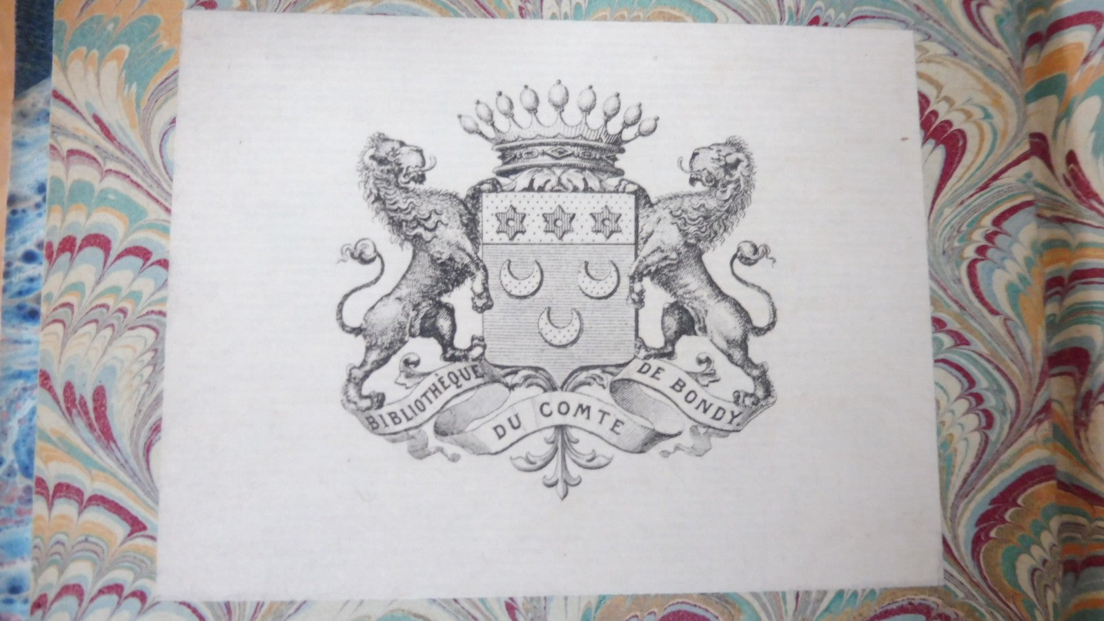 Demi chagrin à coins. Dos lisse, orné, mosaïqué, bel état. Coiffe et mors sains, menues épidermures. Plats et coins en bel état. Tête dorée. Couverture conservée. Intérieur frais. Envoi manuscrit de l'auteur à Madame de Saint-Victor. Ex-libris aux armes du comte Taillepied de Bondy.