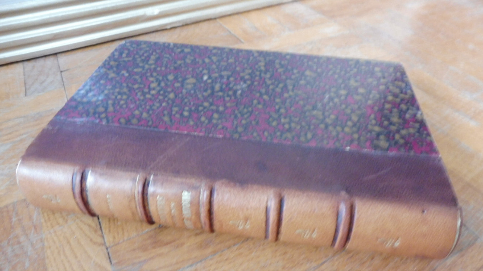 Demi cuir à 5 nerfs. Dos, coiffe et mors en bel état, menus frottements. Plats corrects, frottements. Tranches et intérieur passés.