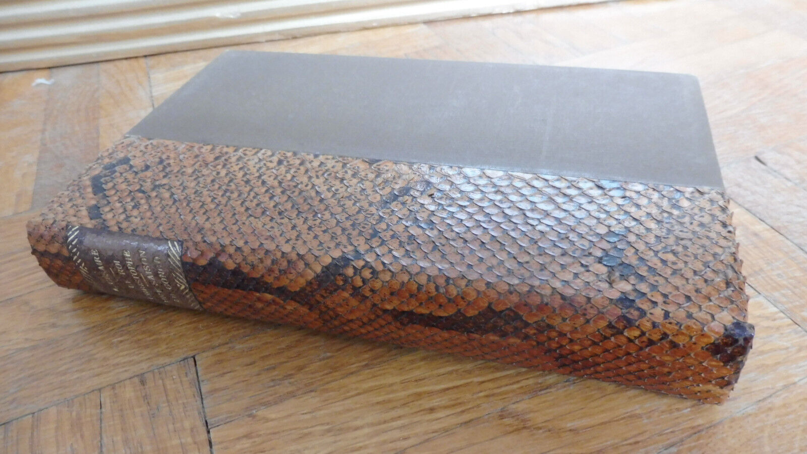 Demie peau à dos lisse et pièce de titre. Dos serpent véritable, bel état. Coiffe, mors et plats en bel état. Tranches et intérieur frais.