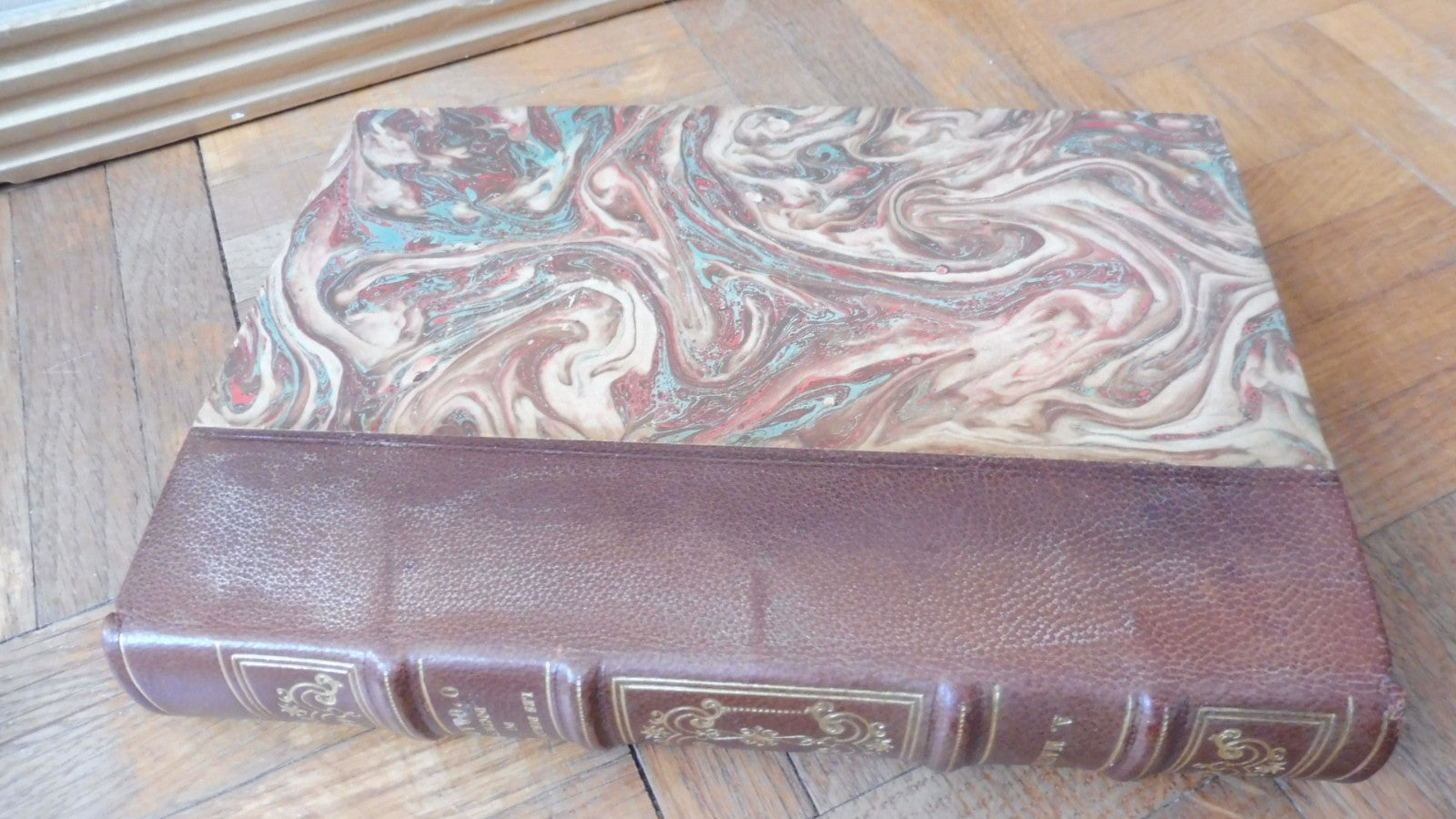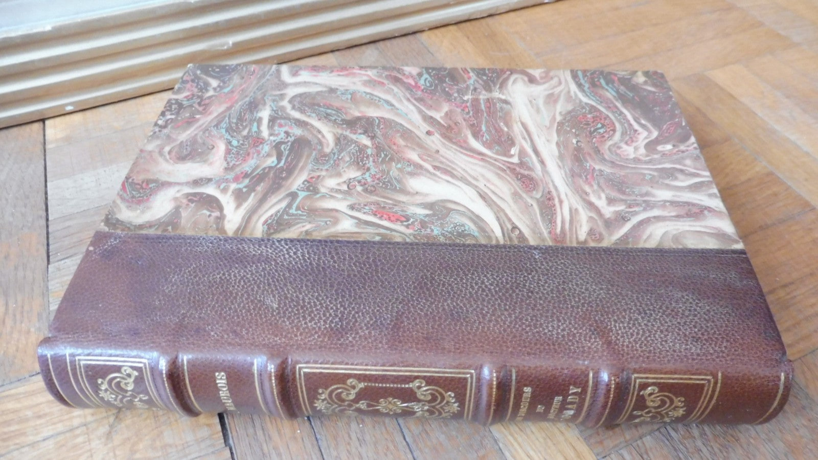 Demi cuir à 4 nerfs. Dos orné, bel état. Coiffe et mors sains. Plats idem. Tête dorée. Intérieur frais. Couverture conservée. Exemplaire imprimé sur vélin pur chiffon Lafuma.