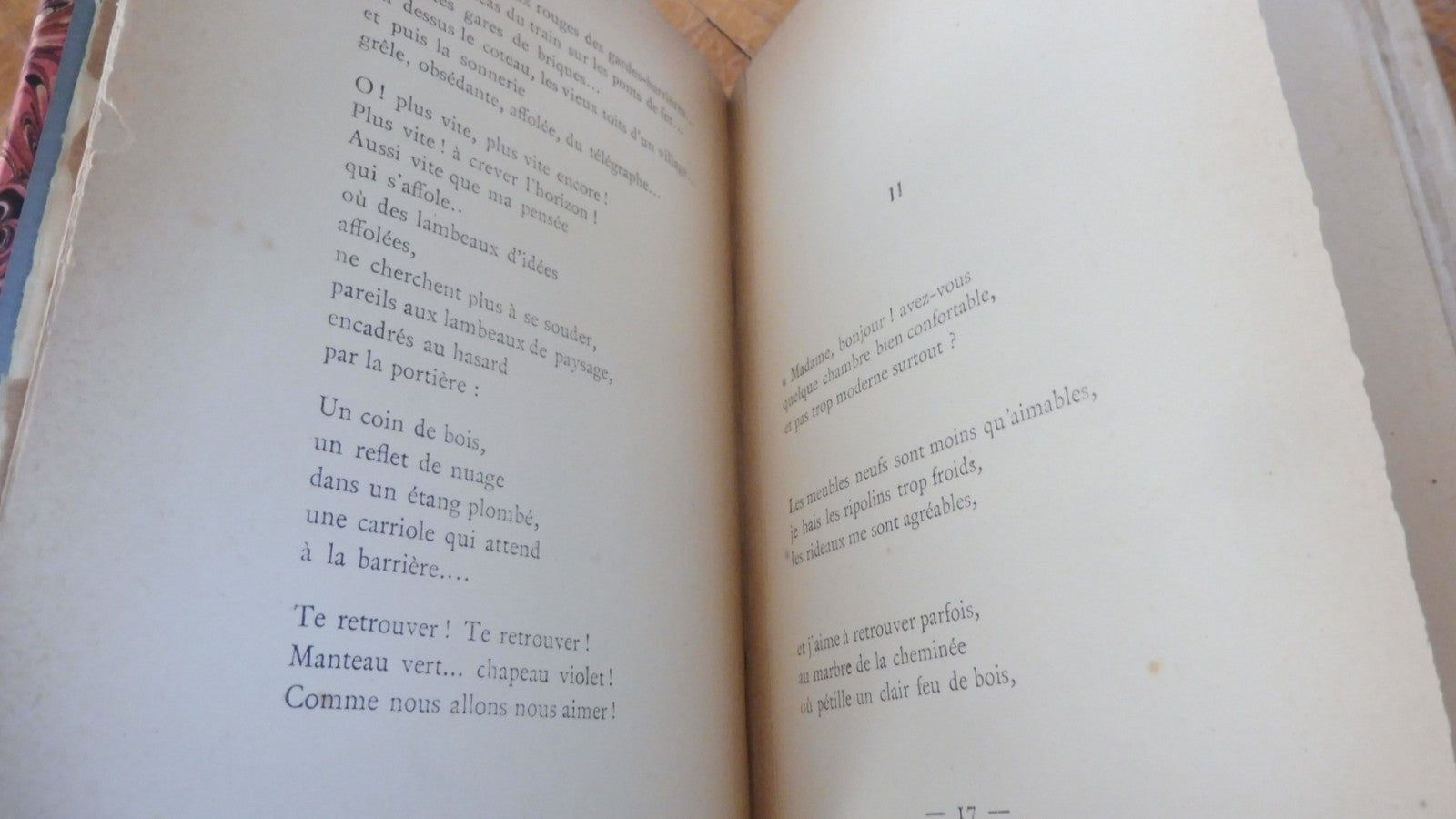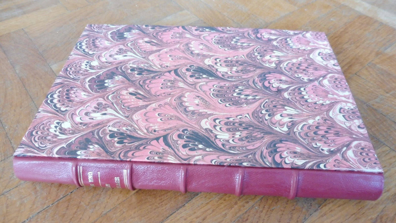 Demi cuir à 5 nerfs et pièce de titre. Jolie reliure postérieure, bel état. Tranches passées. Intérieur idem. Couverture conservée (usagée). Envoi manuscrit de Roger Eng (le dédicataire ayant été coupé).