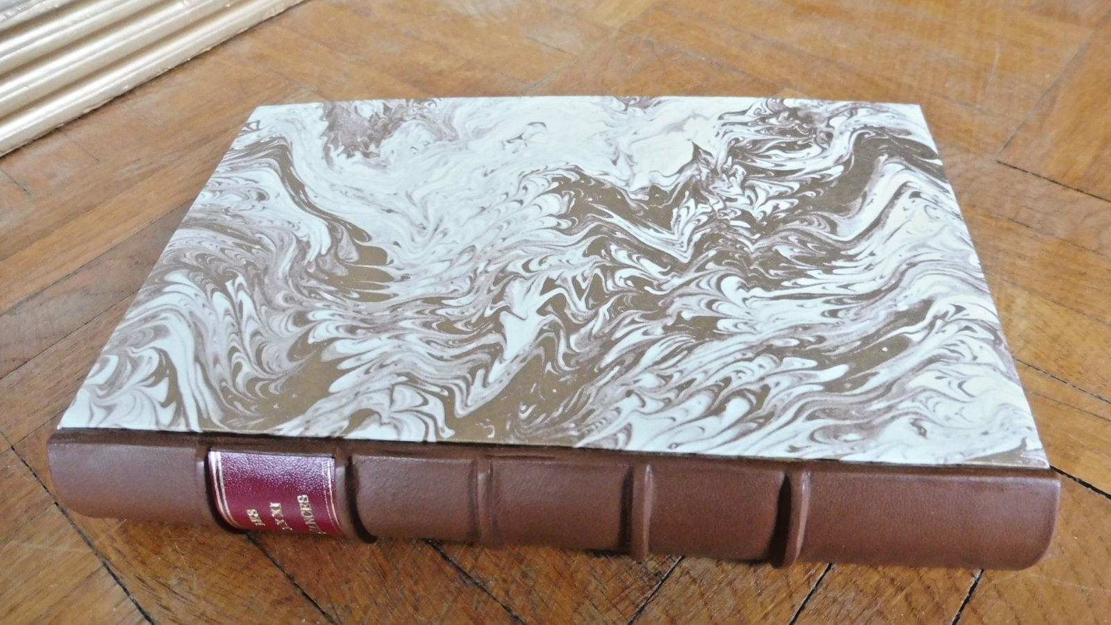 Reliure à plats rapportés postérieure, bel état général. Dos cuir à 5 nerfs et pièce de titre. Tranches et intérieur passés, état d'usage. Couverture conservée.