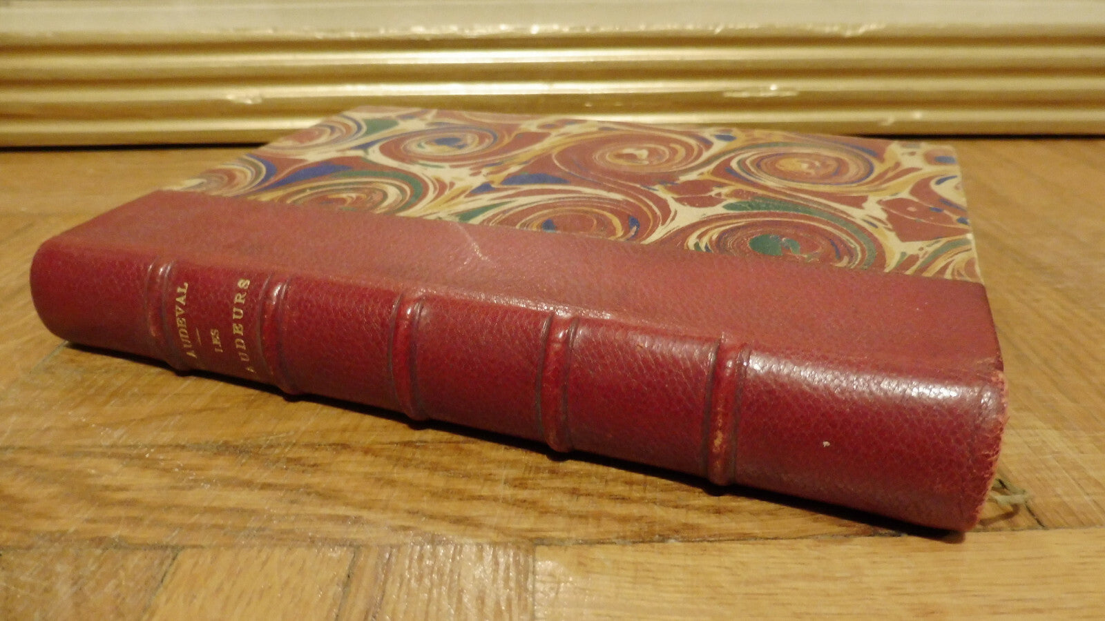Demi cuir rouge à 5 nerfs. Dos en bon état, menus frottements (voir photos). Plats un peu frottés.