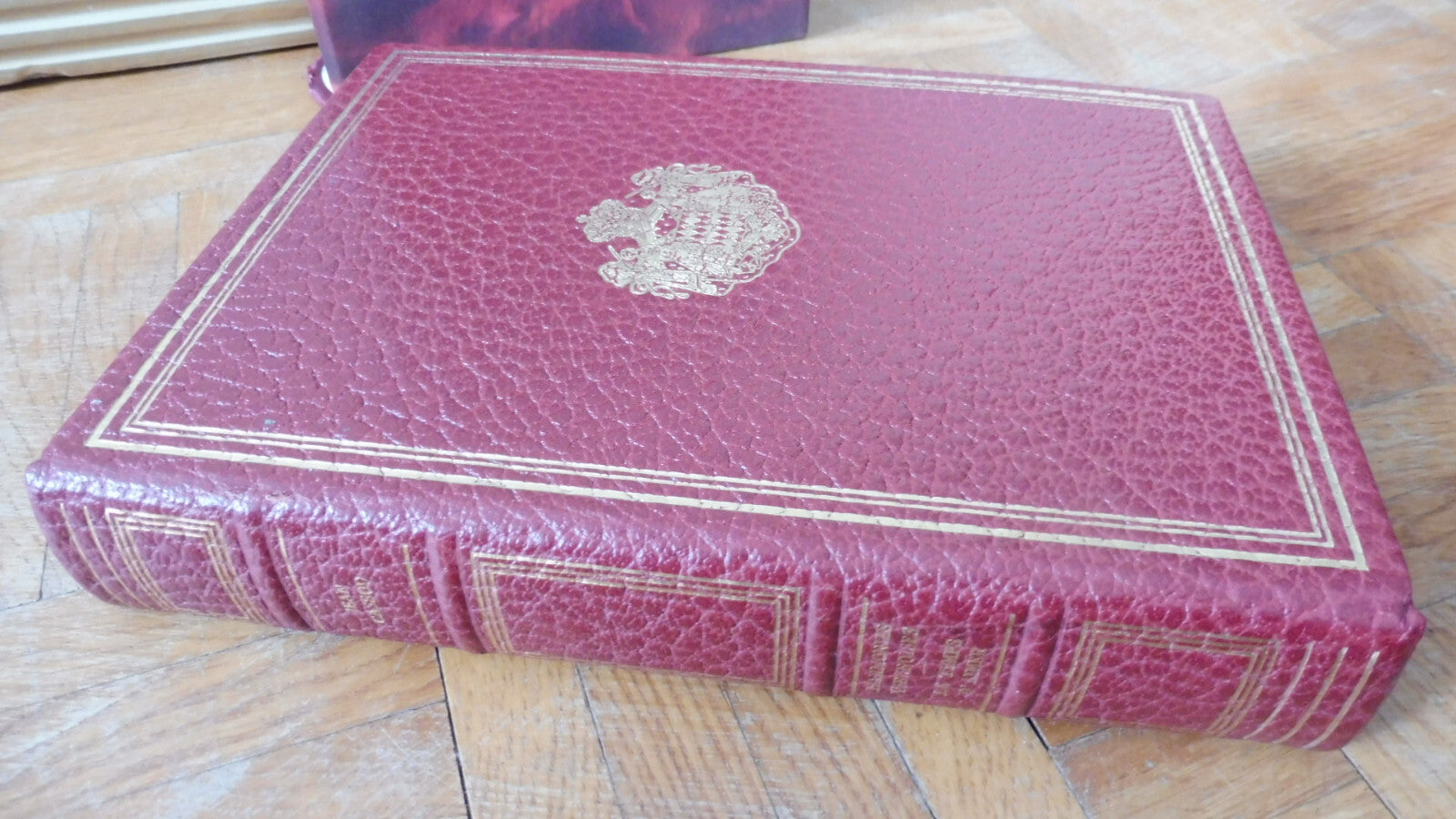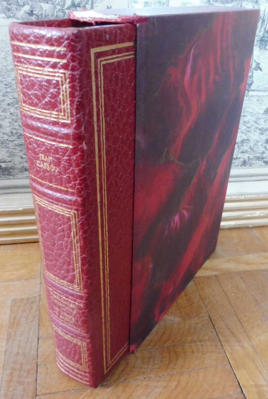 Plein cuir à 4 faux nerfs. Bel état général. Tranches fraîches. Tranche supérieure dorée. Intérieur frais. Sous étui d'origine, bel état, un peu frotté (voir photos).