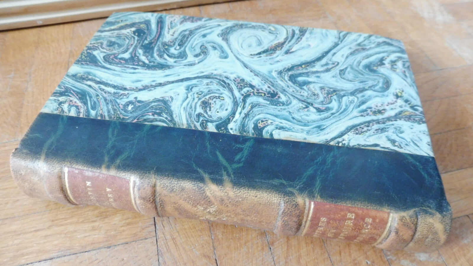 Demi cuir à 4 nerfs et pièces de titre. Dos insolé. Coiffe, mors en bel état. Plats corrects. Tranches et intérieur corrects.