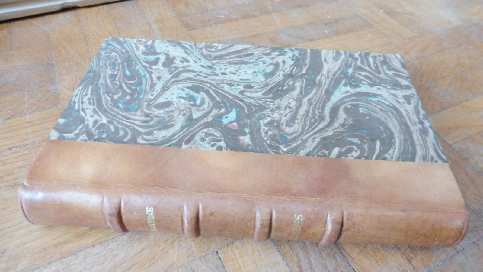 Demi cuir à 4 nerfs. Dos, coiffe et mors en bel état. Plats idem. Tranches et intérieur passés.
