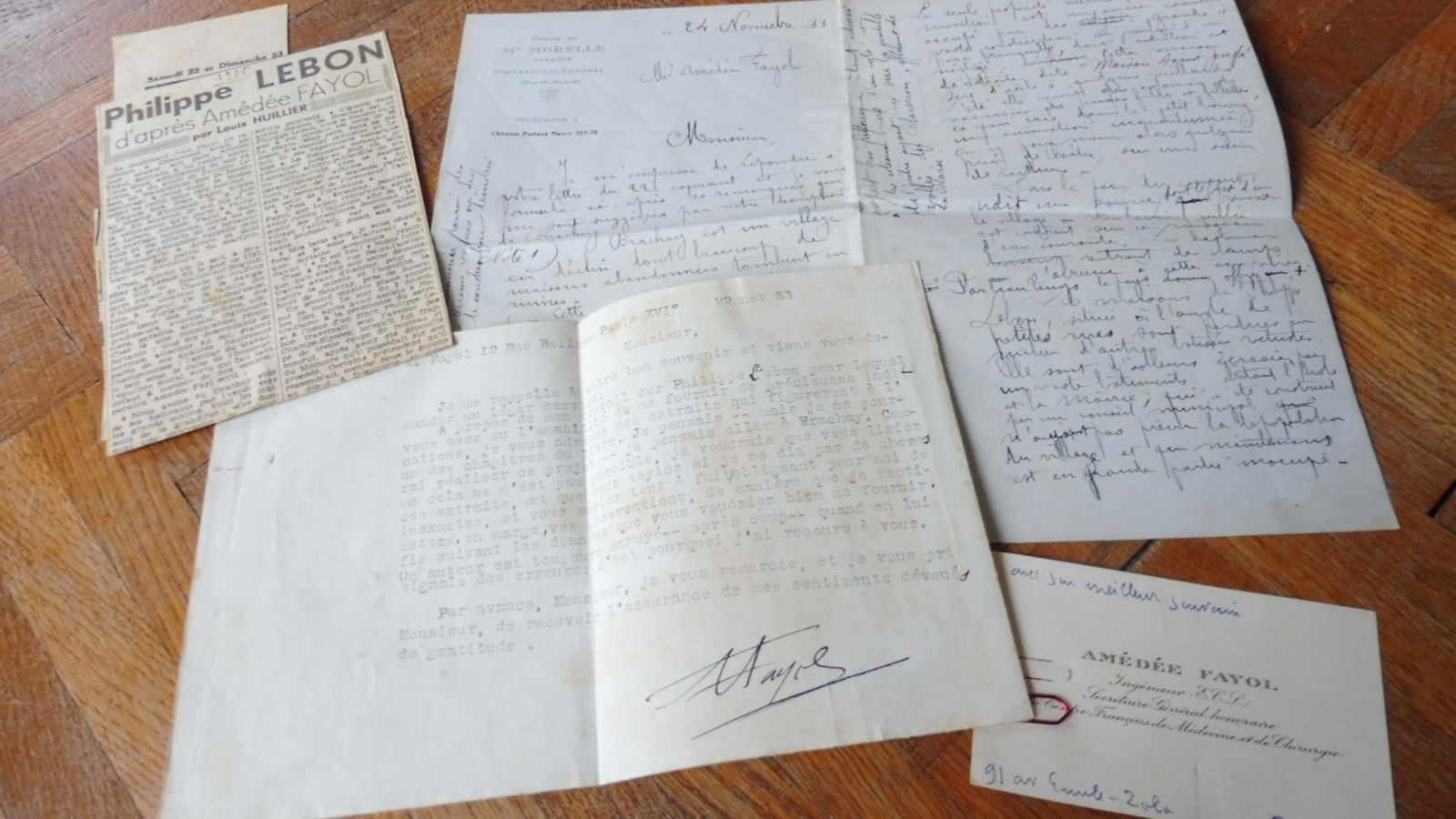 Joint au volume, un ensemble de documents originaux (carte de visite avec autographe, 2 articles de presse, un tapuscrit d'1 feuillet recto signé et daté de nov. 1933, 1 lettre manuscrit d'1 feuillet recto-verso de Fayol à maître Morelle, notaire à Doulevant-le-Château (Haute-Marne), membre de la famille de Philippe Lebon (inventeur de l'éclairage public à gaz).