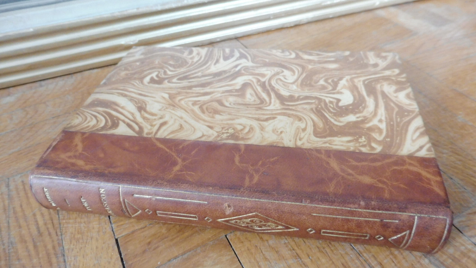 Demi cuir à dos lisse. Dos, coiffe et mors en bel état, menues épidermures. Plats corrects. Tranches et intérieur assez frais. Tranche supérieur dorée.